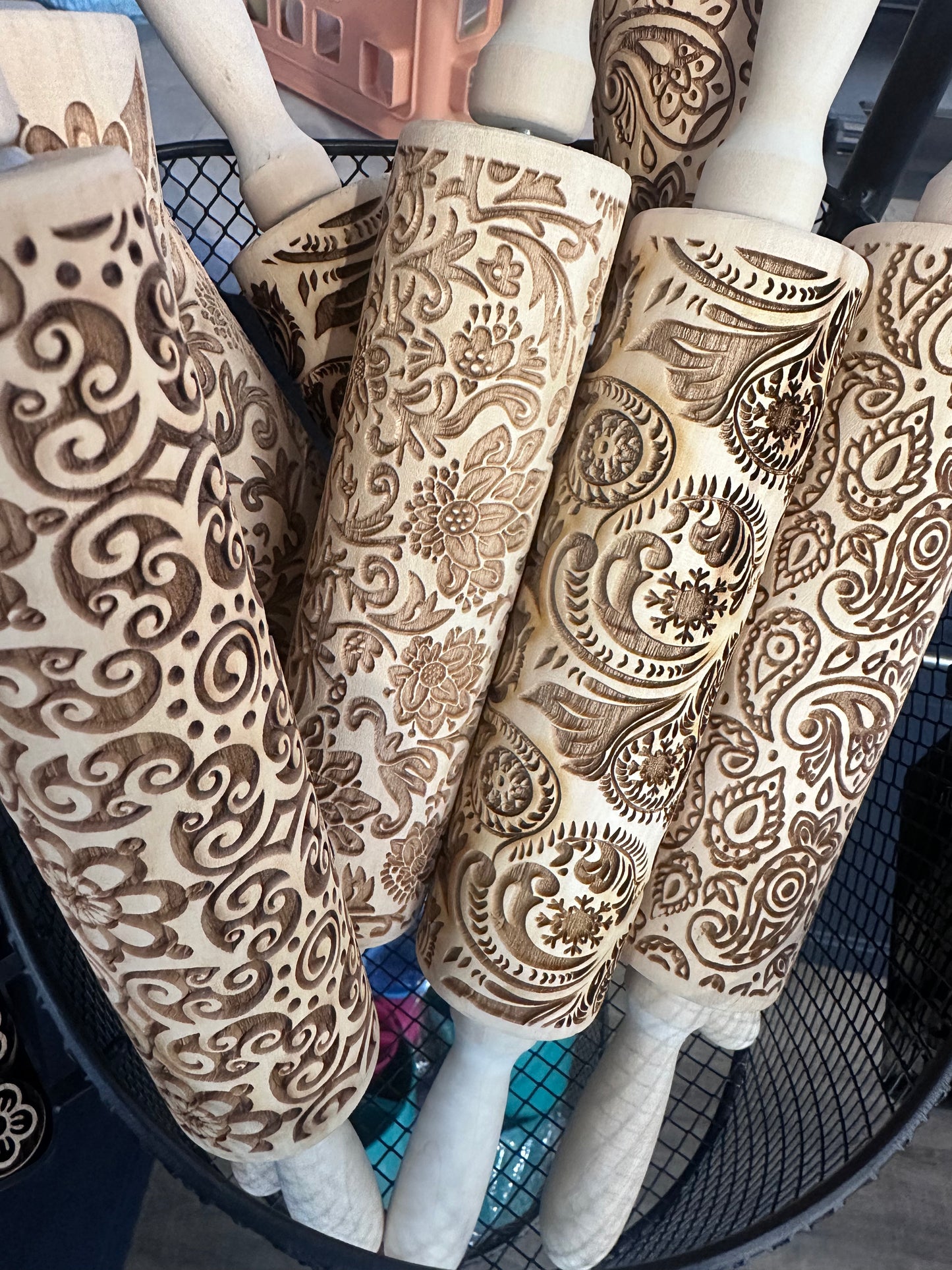 Embossed wooden rolling pins for handbuilding, decorating, and stamping