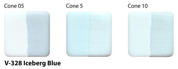 Iceberg Blue Velvet Underglaze is a light blue color that is powder blue at cone 05, slightly darker at cone 5, and maintains its light blue shade up to cone 10. A clear glaze over Iceberg Blue tends to lift the color out slightly, lightening it.