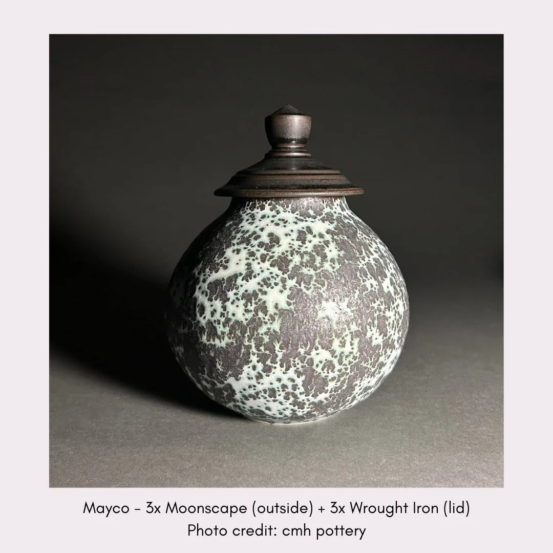 Cone 6: Moonscape is formulated to produce a medium gray to white variegation mottled with black crystals. Light coats will produce a matte gray finish with little white variegation and few crystals. Use three or more coats to produce more white variegation and crystals. At cone 5, this glaze will produce a matte sepia finish with little breaking over texture.