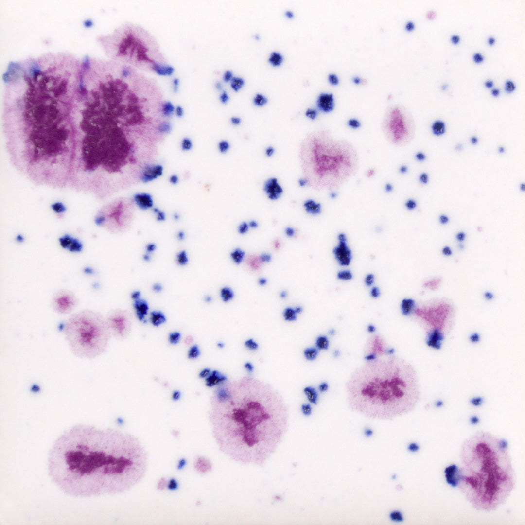 Cone 06 oxidation: Matte white with large purple and small blue crystals
